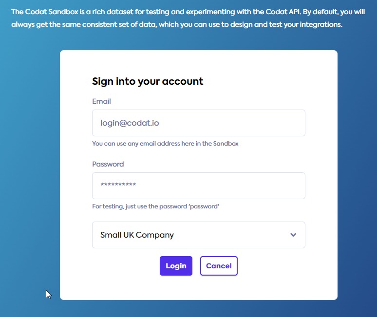 - Create a Codat companyCompany In Codat, a company represents your customer's business entity. Companies can have multiple connections to different data sources. and connect it to the Codat Sandbox,