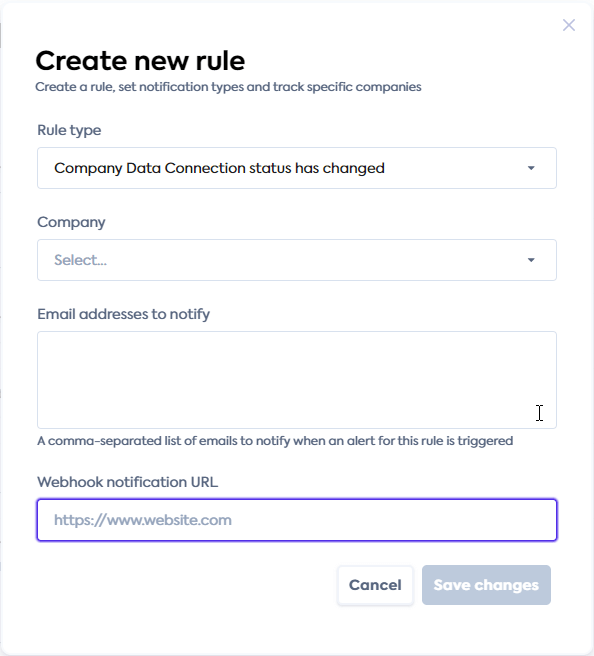 Rule typeWebhookWebhook An automated notification sent from Codat to your application when specific events occur, such as when data syncs complete or connections change status. notification URL